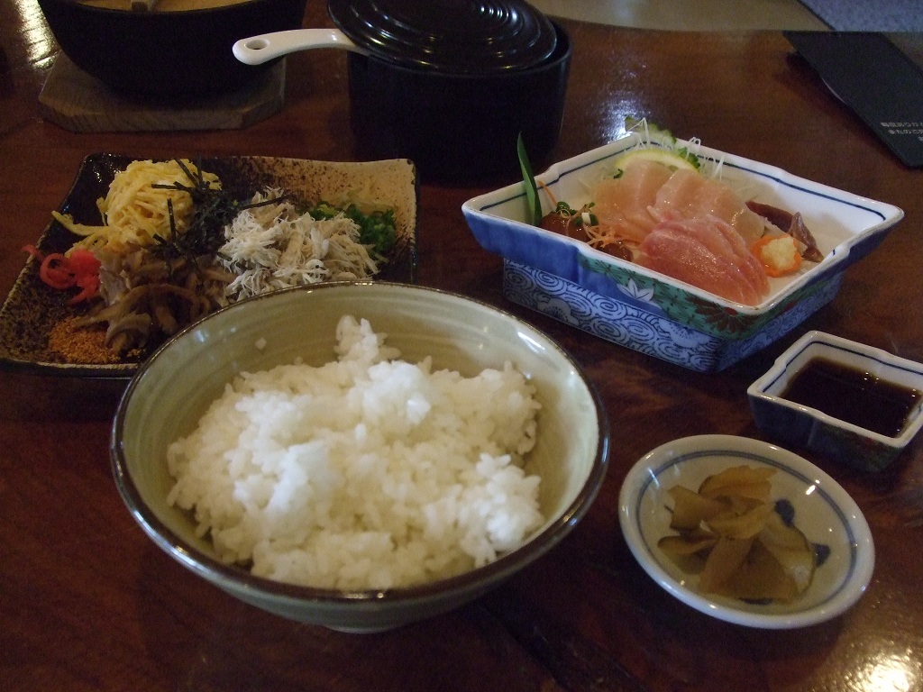 それと鶏刺身のセット。ご飯の横にあるのは奄美の定番パパイヤの漬物。