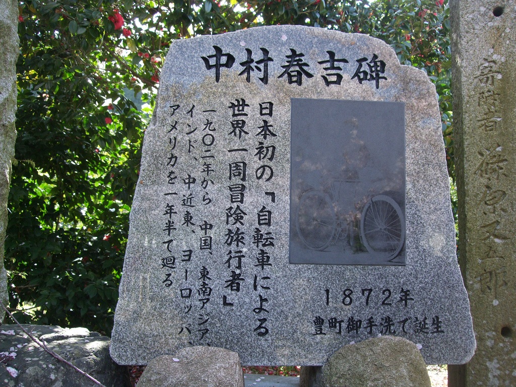 神社脇にある自転車世界一周冒険旅行者の碑。
